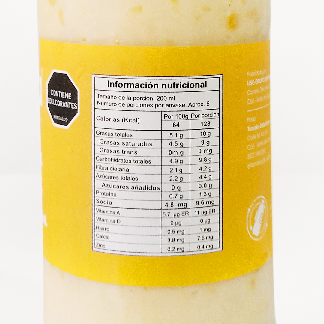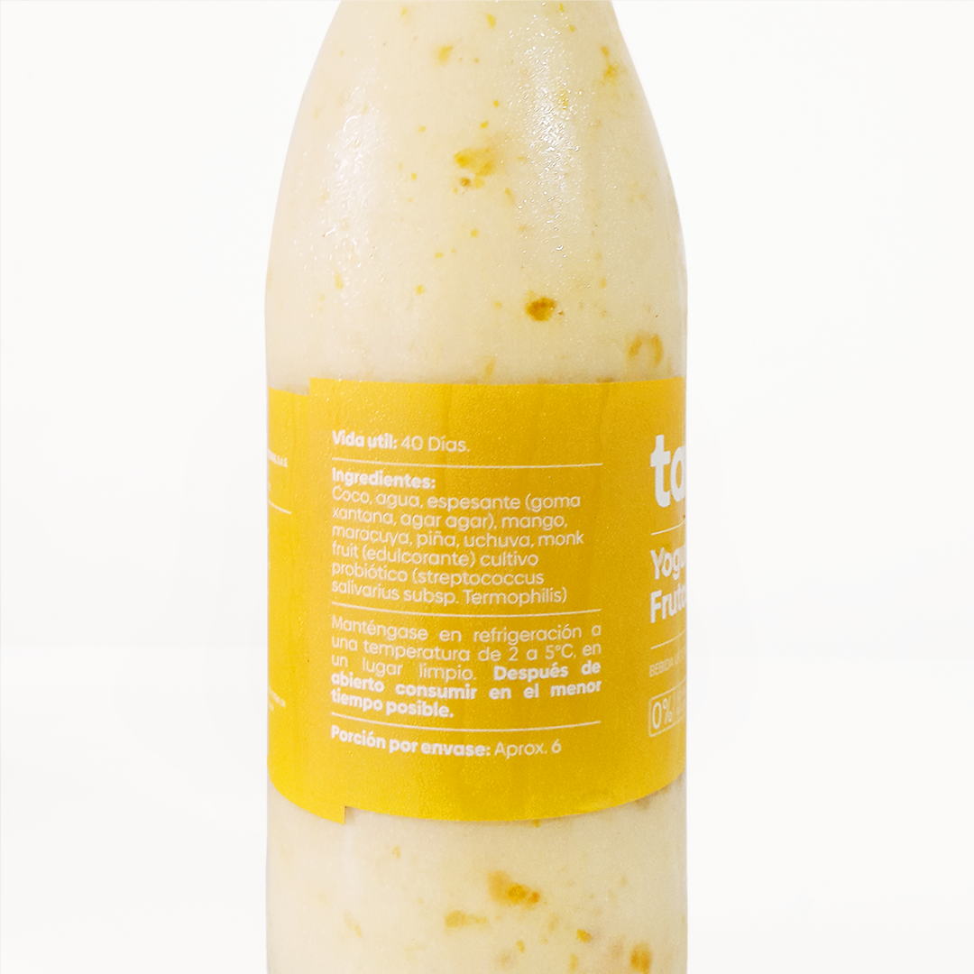 Ingredientes: Coco, agua, espesante (goma xantana, agar agar) mango, maracuyá, piña, uchuva, monk fruit (edulcorante), cultivo probiótico (streptococcus salivarius subsp. Termophilis)
